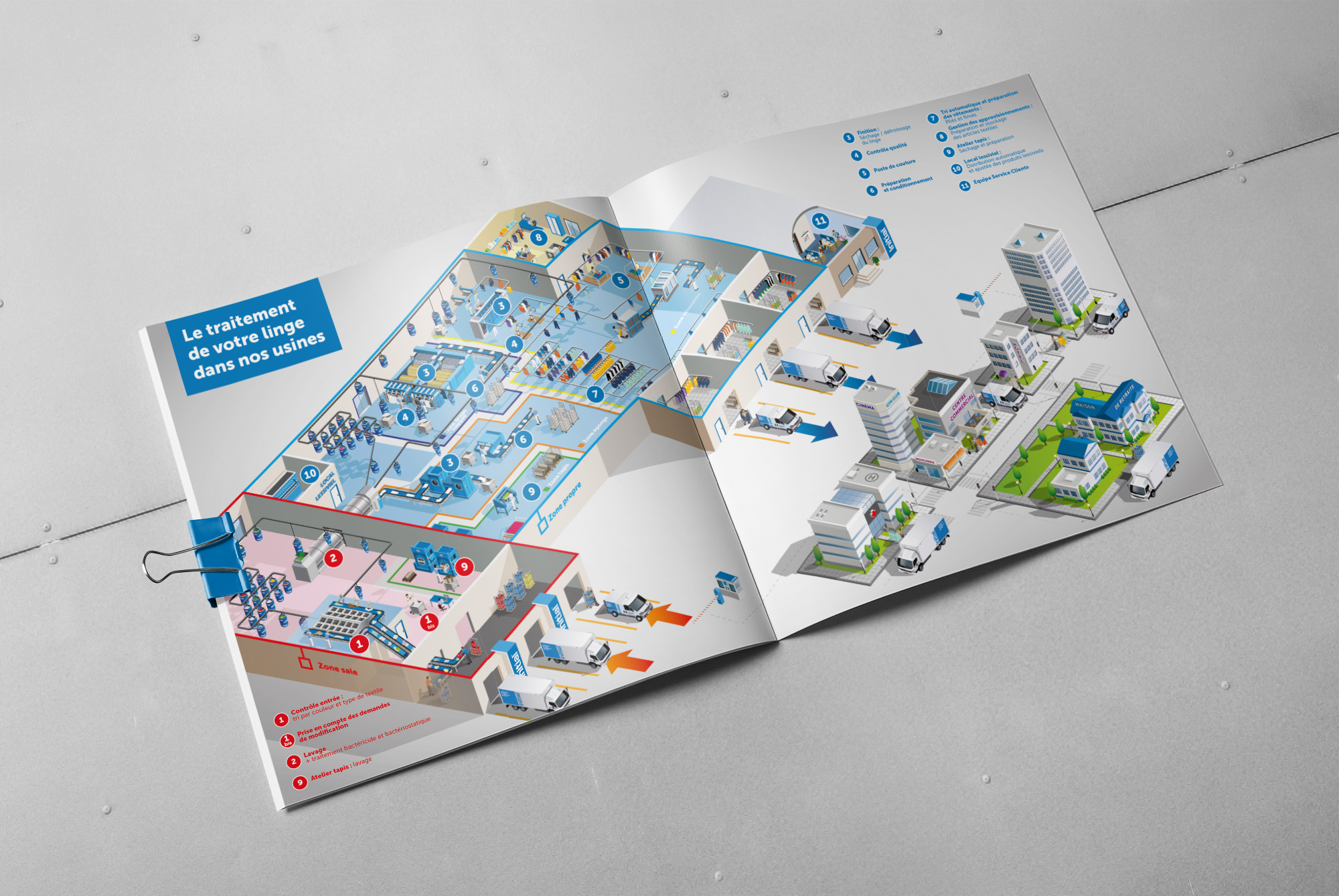 For more than 80 years, Initial is the world leader for services to companies. Artwork in isometric perspective especially achieved in order to be inserted in the User’s Guide remitted by Initial to each of their clients. Very detailed drawing aimed at showing laundry treatment from collection to delivery through all cleaning steps.